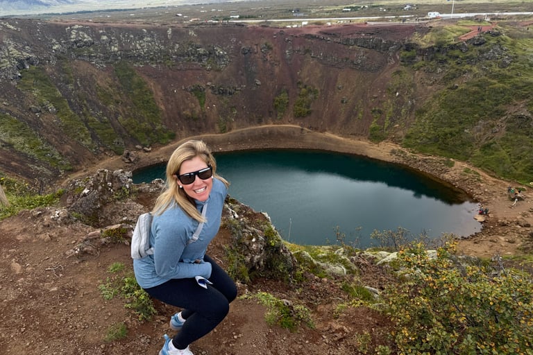 One of the first stops on our Golden Circle drive was Kerið Crater, a volcanic crater lake that’s as colorful as it is unique. Unlike some of Iceland’s other stark black lava fields, Kerið is painted in shades of deep red and burnt orange, with green moss clinging to the slopes and a bright turquoise lake at the bottom. The contrast is striking, and on a sunny day, it looks almost surreal.